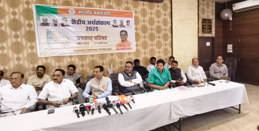 अग्रेसन भवन येथे आज, २३ फेब्रुवारी रोजी भारतीय जनता पार्टीच्या वतीने आयोजित पत्र परिषदेत माहिती देताना भाजपा आर्थिक प्रकोष्ठचे प्रदेश संयोजक मिलिंद कानडे बोलत होते. यावेळी पत्रकार परिषदेत भाजपा जिल्हाध्यक्ष अॅड. येशुलाल उपराडे, आ.विनोद अग्रवाल, आ.संजय पुराम, माजी आमदार हेमंत पटले, माजी जि.प.अध्यक्ष विजय शिवणकर, पंकज रहांगडाले, जिल्हा महामंत्री सुनिल केलनका, सिताताई रहांगडाले, अनिल येरणे, दिनेश दादरीवाल, जयंत शुक्ला, झामसिंग येरणे, मनोज मेंढे, अमित झा, छत्रपाल तुरकर, कशिश जायस्वाल आदि उपस्थित होते.